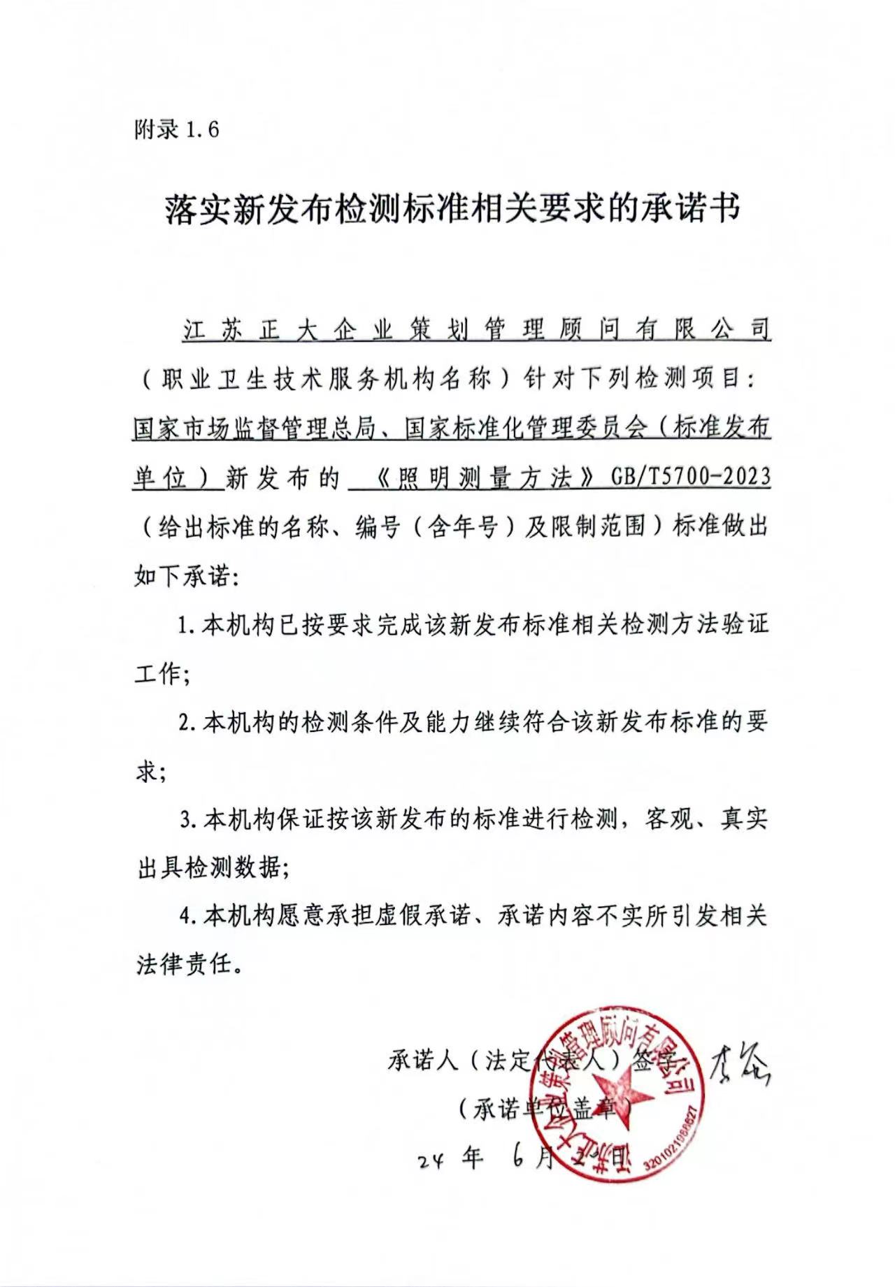 落實新發(fā)布檢測標(biāo)準(zhǔn)相關(guān)要求的承諾書