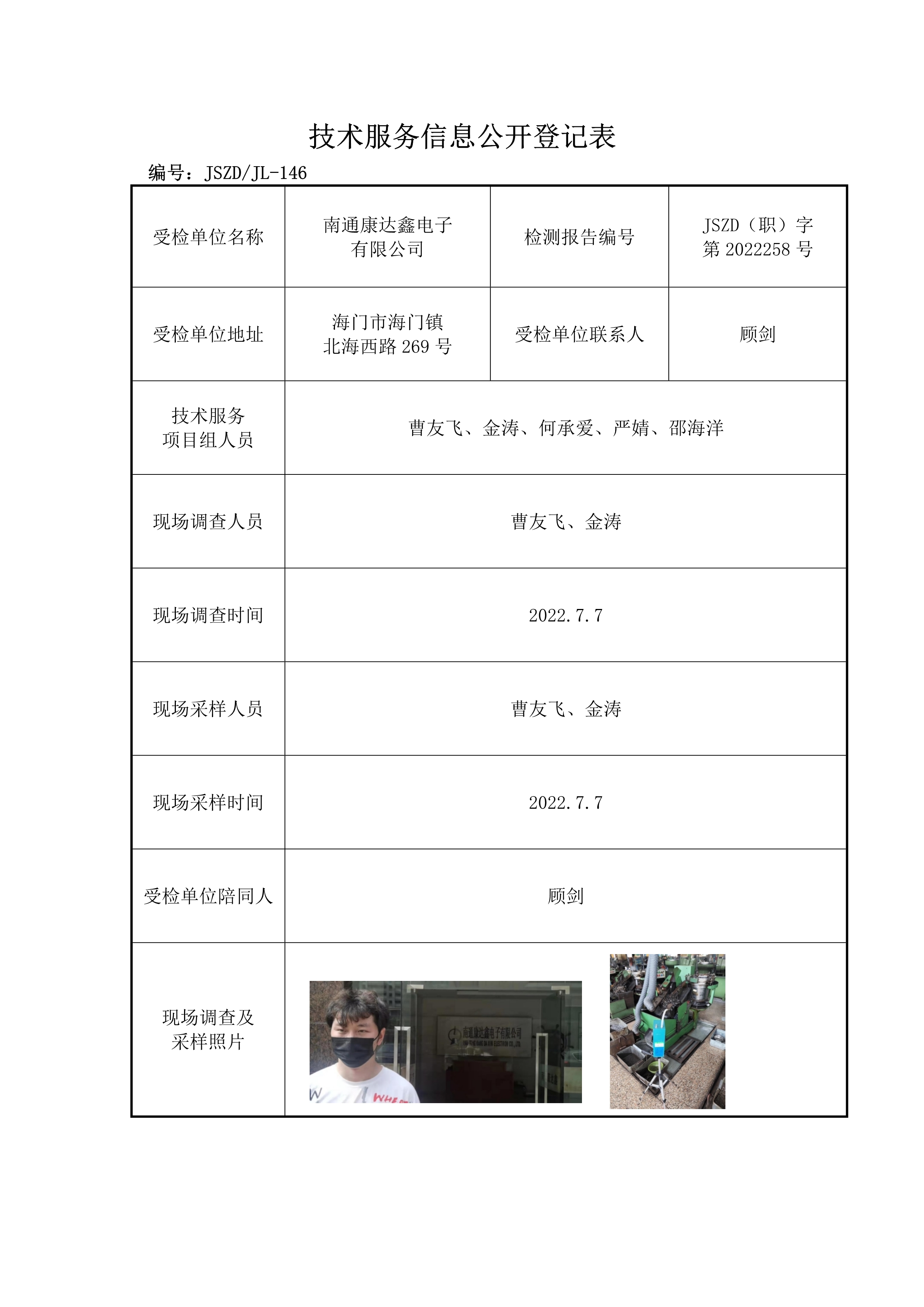 2021-2022南通地區(qū)檢驗檢測項目公開——正大JSZD(職)字第2022258號南通康達鑫電子有限公司職業(yè)病危害因素檢測報告